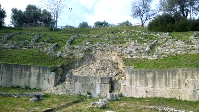 Crolla la gradinata del teatro greco romano di Portigliola. Sono stati i recenti eventi alluvionali a causare gli smottamenti che hanno danneggiato tutta la parte centrale delle postazioni costruite nel VI o III secolo avanti Cristo dai Greci di Locri. ...