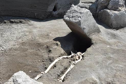 Il torace schiacciato da un grosso blocco di pietra, il corpo sbalzato all’indietro dal potente flusso piroclastico, nel tentativo disperato di fuga dalla furia eruttiva. E’ in questa drammatica posizione, che emerge la prima vittima del cantiere dei nuovi scavi ...