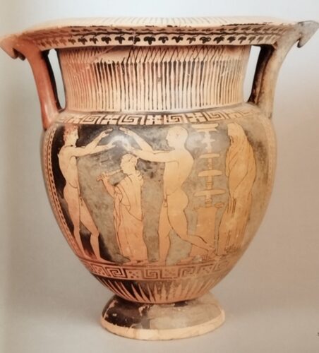 Il cratere (altezza cm 38,5; diametro 40,5 cm circa), che rientra nella produzione etrusca a figure rosse, si ispira a modelli attici e presenta elementi del cd Gruppo di Bologna 824. I vasi del gruppo, di solito di grandi dimensioni, ...