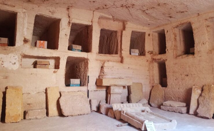 Scendono per una scala e si trovano al cospetto di ipogei scavati nella roccia. Altre parti sono scolpite su lastre di pietra calcarea. Un corridoio sotterraneo conduce a un altro vano preceduto da una parete finemente decorata nella quale si ...