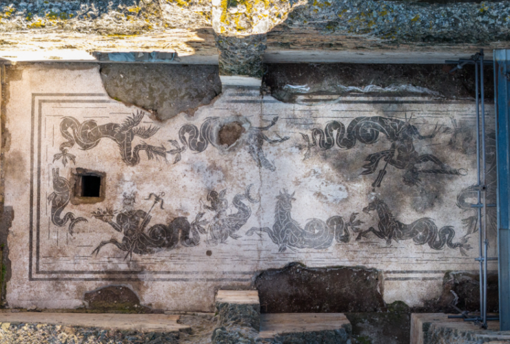 Sotto il viavai quotidiano di aerei diretti all’aeroporto di Ciampino (Roma) un corteggio di animali marini sembra rincorrersi a un cenno di Poseidone, mentre un delfino cavalcato da un amorino muove alla conquista di Anfitrite. Questo tappeto musivo con «thiasos» ...