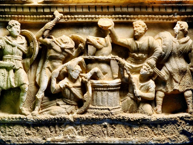 Sulla cassa di alcune urnette funerarie di produzione volterrana e perugina (ad oggi conosciamo otto esemplari) viene rappresentata la scena di una belva non ben definita, forse un lupo, che tenta di uscire da un pozzo (puteale). L’animale è stato ...
