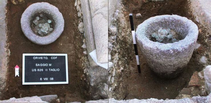 Il presente contributo analizza il thesaurus rinvenuto nel Tempio A di Campo della Fiera, area comunemente identificata con il Fanum Voltumnae. Lo studio approfondisce le caratteristiche materiali e numismatiche del deposito, mettendo in luce la possibile riutilizzazione del contenitore litico ...