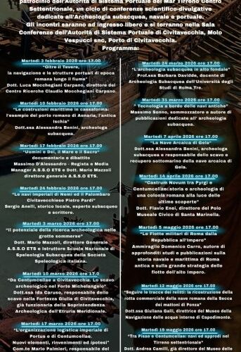 Vedi programma allegato: CASN-LANS Organizzazione: CASN-LANS (Centro Archeologico Studi Navali), con il patrocinio dell’Autorità di Sistema Portuale del Mar Tirreno Centro Settentrionale, tutti i martedì, alle ore 17,00, presso la Sala Conferenze dell’Autorità di Sistema Portuale di Civitavecchia, Molo Vespucci ...