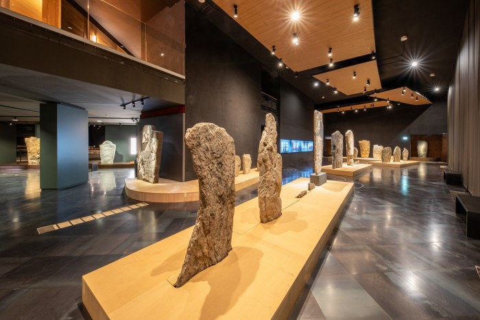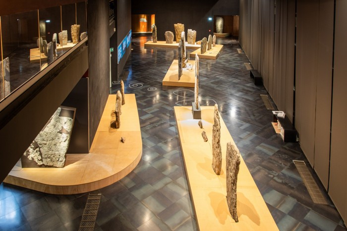 Spettacolare è anche la Grande Sala delle Stele, il nuovo allestimento che lungo le fosse d’impianto di pali lignei rituali (non più esistenti) allinea le 46 stele antropomorfe dedicate a guerrieri, eroi o divinità: monumenti religiosi, senza dubbio, ma anche primordiali opere d’arte, dove per la prima volta l’uomo prova a raffigurare parti del corpo, abiti e ornamenti. Le stele arcaiche, una dozzina, sono lavorate su entrambe le facce: probabilmente celebravano capi guerrieri della comunità. Ci sono poi stele “di transizione”, sempre facciali, forse già lavorate con strumenti in metallo e votate a divinizzare un antenato. Infine le stele più evolute esibiscono raffinate e complesse descrizioni di parti del corpo, ornamenti, abiti, accessori e armi.
