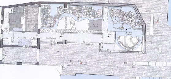 Nella porzione settentrionale c’è un motivo a piccoli quadrati concentrici attorno a un bottone nero realizzati con l’utilizzo di tessere di cotto. Il più ampio spazio di forma allungata, invece, è decorato da una composizione a reticolato ornata da losanghe e quadrati. Al centro del percorso espositivo e al livello più profondo, invece, si conserva parte di una casa del I secolo dopo Cristo, con i resti di muri recanti ancora la decorazione ad affresco per un’altezza di più di un metro.