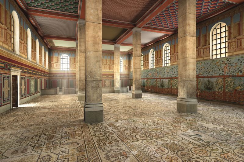 «L’architettura è stata ricostruita sulla base degli elementi superstiti e dei rilievi planimetrici, mentre per le strutture circostanti (horrea e domus) si è operato per analogie tipologiche in relazione allo sviluppo planimetrico derivante dai rilievi. Per gli interni – chiarisce Stefano Moretti di Altair4, che ha curato la ricostruzione virtuale – la ricomposizione degli affreschi parietali è stata realizzata per estensione e completamento della fascia inferiore superstite che ci ha restituito la metrica dei moduli e l’alternanza dei temi e dei colori, allo stesso modo in cui la ricomposizione dei motivi architettonici nella fascia sommitale ha seguito gli stilemi classici delle pitture con elementi e proporzioni ricavate dai lacerti di trabeazione dipinta superstiti, mentre nella ricostruzione degli elementi musivi delle pavimentazioni si è operato per similitudine con gli elementi tuttora presenti in situ ricostruendo un fotopiano ad altissima risoluzione formato da decine di fotografie dei singoli riquadri».