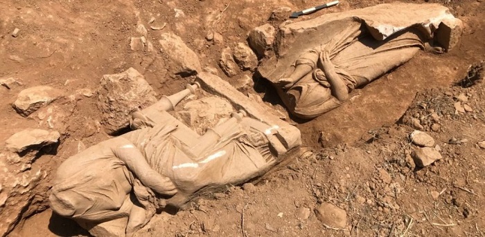Le statue, rappresentate a grandezza naturale, sono state trovate in frammenti e sono entrambe acefale.