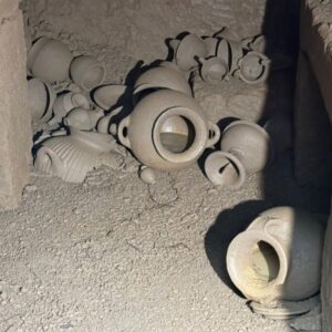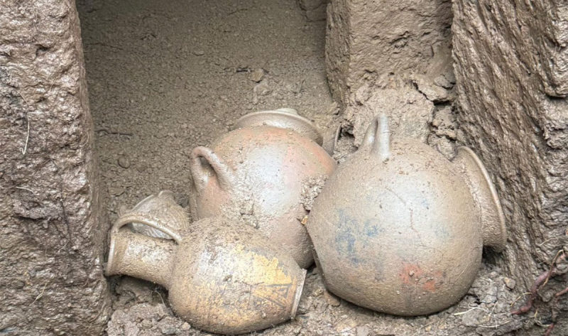 L’area del Caiolo, già nota per precedenti ritrovamenti, ha riservato questa volta un contesto unico: una camera sepolcrale ancora sigillata. Rimossa la lastra di chiusura, gli archeologi si sono trovati davanti as una scena intatta: numerosi vasi, alcuni in ceramica fine dipinta in stile etrusco-geometrico, sono disposti secondo un preciso rituale. Uno di essi, collocato presso l’ingresso, sembrerebbe testimoniare un gesto cerimoniale di particolare rilievo.
