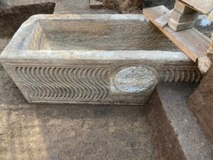 Lo spazio funerario ospitava, all’interno di un recinto o di un monumento funerario, un sarcofago in marmo greco con coperchio, probabilmente databile al III sec. d.C. Il sarcofago reca, su uno dei lati lunghi, una decorazione con scanalature ondulate verticali, disposte simmetricamente ai lati di un tondo centrale con sottostante campo rettangolare.