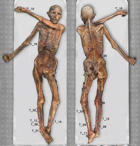 Gli studiosi dell’Istituto per le mummie e l’Iceman dell’EURAC, l’Accademia europea di Bolzano, hanno tracciato la prima mappa di tutti i rudimentali tatuaggi presenti sul corpo del cacciatore neolitico, il più antico essere umano mummificato mai scoperto in Europa; ma non fanno ancora ipotesi sul loro scopo o il loro significato.