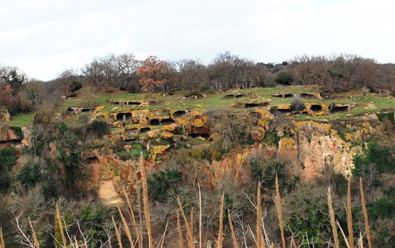 Nella parte meridionale dell’altopiano, esposti a sud-est, lungo il versante che guarda verso il fosso Sodera, si trovano circa quaranta cavità scavate nel tufo, quasi tutte situate su uno stesso livello, per una lunghezza complessiva di diverse centinaia di metri.