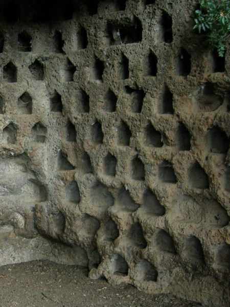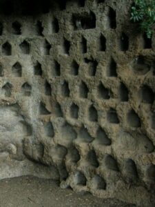 Vi erano poi dei grandi colombai (fig. 4) realizzati sui costoni tufacei, utilizzati per l’allevamento dei colombi. Queste strutture potevano ospitare migliaia di volatili utilizzati per uso alimentare e per il guano impiegato come fertilizzante. I colombi hanno ridotte necessità di cura e controllo da parte dell’uomo e in caso di assedio da parte di forze nemiche sono in grado di procurarsi autonomamente il cibo e rientrare nelle loro cellette superando qualsiasi blocco ed ostacolo.