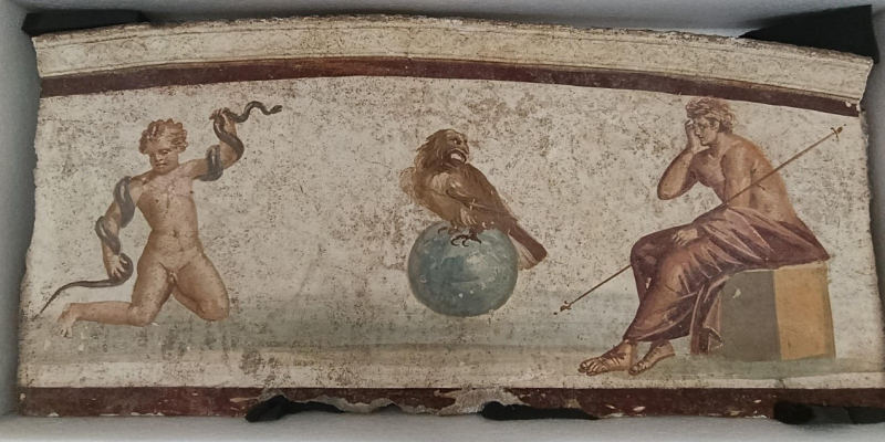 Si tratta del frammento di un affresco raffigurante Ercole bambino nell’atto di strozzare i serpenti, un tempo collocato nello spazio di una lunetta superiore della parete di fondo dell’ambiente – che risultava asportata da tombaroli – e le cui caratteristiche consentono di riconoscerne inequivocabilmente la provenienza da tale contesto.