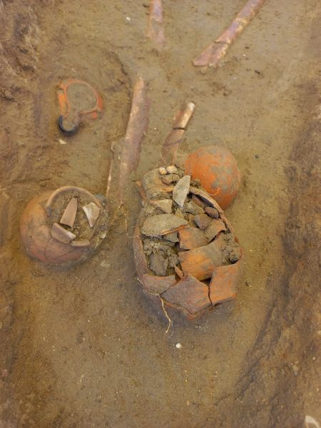 La prima, una fossa terragna con cuscino funerario in coppi rovesciati ha come corredo una bottiglia in ceramica, due brocchette in ceramica comune e una lucerna di tipo “firmalampe” con bollo di produzione “VIBIANI”.
