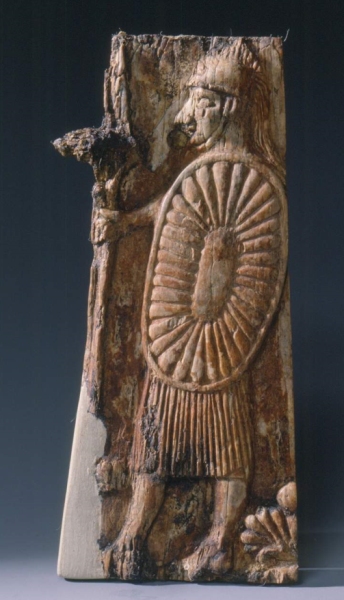 – Placchetta d’avorio con guerriero dal Tumulo di Montefortini a Comeana, tomba a tholos (seconda metà VII secolo a.C.). Foto Soprintendenza ABAP Firenze, Pistoia, Prato
