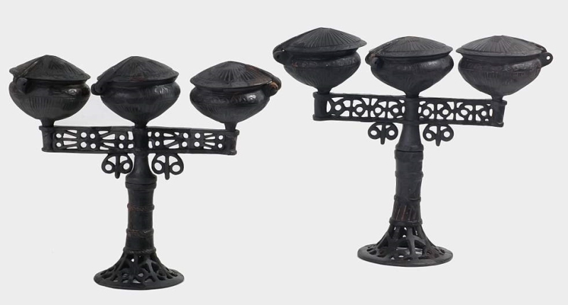 – Coppia di incensieri di bucchero dal Tumulo di Montefortini a Comeana, tomba a tholos (seconda metà del VII secolo a.C.). Foto Paolo Nannini, Soprintendenza ABAP Firenze, Pistoia, Prato