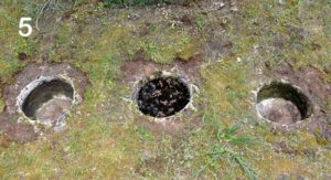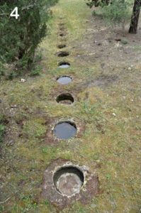 Si tratta di tredici fossi rotondi scavati nella roccia del diametro di cm. 55 circa, profondi cm. 50-35 (foto 4-5-6). Distano tra loro mediamente cm. 60, estendendosi nel senso est-ovest per una lunghezza di metri 13,60. Sono perfettamente allineati e soltanto un paio sono più piccoli degli altri.