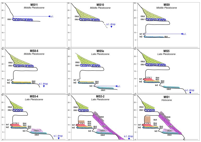 Figura 3 – Evoluzione della costa davanti a Grotta Romanelli nel corso del Pleistocene.