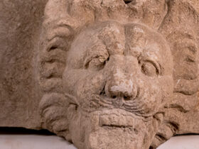 Una testa di leone in marmo prezioso, ancora intatta. Dovrebbe trattarsi dello sbocco di ...