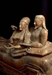 L’iconografia etrusca si ispira alla moda greca di derivazione orientale e si arricchisce della presenza delle mogli, che, in ragione della loro rilevante posizione sociale, partecipavano al convivio accanto ai mariti.