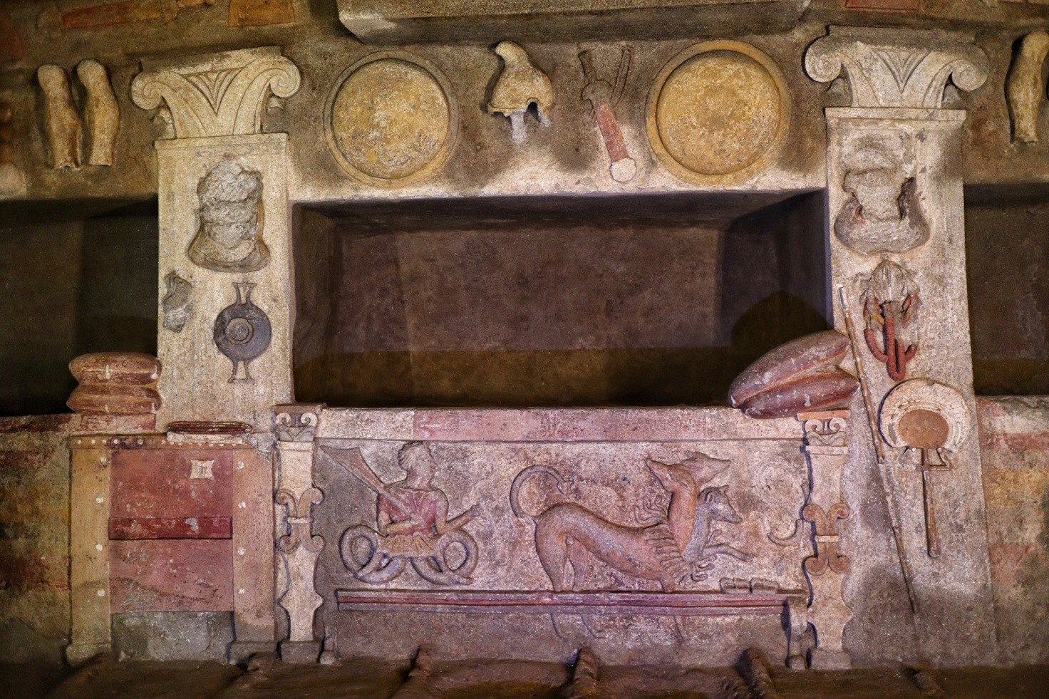 Tra le armi si segnalano spade sguainate e spade nel fodero, elmo frigio, elmi a calotta emisferica e conica, schinieri, scudi circolari. Secondo quanto affermato dal Campana, ai fianchi della porta d’ingresso vi erano due guerrieri in stucco dipinto con berretto frigio e la spada sguainata (oggi scomparsi) a guardia o custodia della tomba. Sempre secondo lo scopritore ottocentesco nell’ipogeo furono trovate anche armi di guerrieri ivi sepolti; George Dennis, in particolare, riferisce che parti delle armature di bronzo furono trovate nelle nicchie sepolcrali.