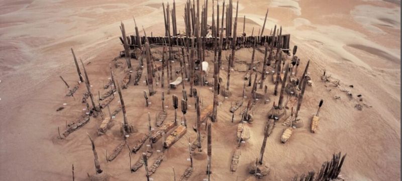 Su una di queste dune, nel 1910, un contadino che vagava nella zona desertica aveva visto pali piantati nella sabbia e barche ormeggiate, ad ogni palo. Come avviene in una laguna. Mettiamo, a Venezia. Pensiamo a tanti pali e a tante barche a remi, ormeggiate, a Venezia. Ma qui le barche ormeggiate erano sprofondate nella sabbia.