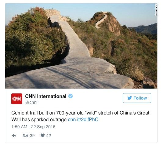A essere colpita è una parte della Muraglia cinese risalente a sette secoli fa (la Grande Muraglia è stata costruita a partire dal 215 a.c., ndr.), come ha raccontato il Beijing News. Ora a chi ha avuto modo di vedere la parte colpita dal ‘restauro’ ha parlato di come la Grande Muraglia sia stata trasformata in una strada. Proprio l’idea che nel 1931 l’allora governo nazionalista cinese aveva avuto, cioè trasformare la Muraglia in un’autostrada. Idea abortita, ma 85 anni dopo il risultato del restauro è poco diverso.