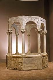 L’altro grande monumento conservato nel Museo Cristiano è il Battistero, detto di Callisto, formato da un ottagono con sette archetti originali ed uno spurio, sorretti da otto colonne che insistono su una balaustra nella quale sono inseriti frammenti di plutei marmorei di epoca alto medioevale. La vasca battesimale è ad immersione ed originariamente era posta dinanzi alla Basilica nella chiesa battesimale dedicata a S. Giovanni costruita dal Patriarca Callisto in luogo del primitivo battistero. Leggiadra è la decorazione degli archetti (tralci vitinei ed intrecci viminei) e plasticamente notevoli i simbolici animali scolpiti. Stilisticamente perfetti i capitelli (assai simili a quelli del Tempietto di S. Maria in Valle) a foglie d’acanto, probabilmente del V-VI secolo e riutilizzati. Sopra gli archi corre un ‘iscrizione dedicatoria che testimonia l’epoca della costruzione degli archetti, da fissarsi almeno agli anni successivi all’insediamento in Cividale del Patriarca Callisto, proveniente da Cormòns (737-756). Nel Battistero si incontrano e si amalgamano modelli e influssi classico-bizantini ed orientali; domina implacabilmente l’ornamentazione geometrica pur sullo sfondo di insistenze classiche e di richiami al perduto naturalismo del glorioso tralcio negli archivolti. Nella composizione ornamentale assume una funzione decisiva il folto gruppo dei motivi fantastici vegetali ed animali provenienti dall’Oriente ulteriore e destinati, proprio per la loro appartenenza al mondo culturale che non amava rappresentare la figura umana, ad influenzare negativamente il faticoso processo occidentale di riconquista della scultura figurativa, di cui un esempio o tentativo di grande valore si era realizzato certamente prima del tegurio callistino, nell’ Altare di Ratchis. Su di un lato del parapetto ottagonale del Battistero si trova inserito il cosiddetto pluteo di Sigualdo, originariamente appartenente alla chiesa di S. Giovanni Battista e dedicato -come appare nella iscrizione centrale della lastra -al Patriarca Sigualdo successore di Callisto (756-786). Vi sono raffigurati nei tondi angolari i simboli dei quattro Evangelisti, ciascuno con una iscrizione esplicativa, e nei due riquadri centrali una croce latina con rosette, palme e candelabri (in alto), un albero della vita con teste leonine, colombe e grifi affrontati (in basso). I simboli degli Evangelisti a mezzo corpo, che recano le tavolette con le iscrizioni a ciascuno pertinenti, sono trattati liberamente con scarsi riferimenti alla natura dei singoli animali (aquila, bue, leone), mentre il volto dell’ Angelo a pera rovescia si avvicina fortemente alle figurazioni dell’ Altare di Ratchis. Nella decorazione prevalgono moduli geometrici e animalistici tratti dal repertorio fantastico orientale. Prima di lasciare il Museo Cristiano, si osservino altri frammenti di scultura alto medioevale, tra i quali alcuni interessanti timpani di Ciborio provenienti dalla raccolta del Tempietto.