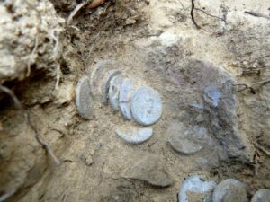 Contattata immediatamente la Soprintendenza, inviava le foto del ritrovamento al funzionario archeologo responsabile del territorio e ricevuta conferma dell’interesse archeologico, rimaneva a sorvegliare la zona fino all’avvenuto recupero di quasi tutte le monete e di alcuni frammenti del contenitore, una piccola olla di impasto. Nei giorni successivi la Soprintendenza provvedeva ad effettuare uno scavo nell’area immediatamente circostante, con il recupero di poche altre monete allontanate in antico, come attesterebbero le fratture consunte del contenitore.