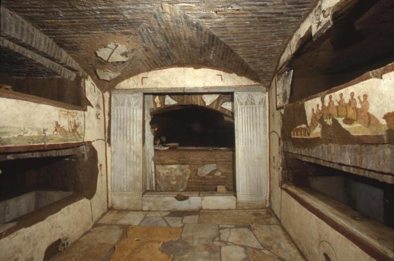 Il termine catacombe, invece, comincia a essere attestato solo nel Medioevo, derivando dall’antico toponimo «ad catacumbas», «presso le cavità», con cui era identificata la località al III miglio della via Appia, sede della memoria degli apostoli Pietro e Paolo e poi della sepoltura di S. Sebastiano ed altri martiri. Quello amministrato da Callisto era dunque «Il Cimitero» per antonomasia, la necropoli ufficiale della Chiesa di Roma, sede di ben 16 tombe di papi, dislocate nel sottosuolo della catacomba e negli edifici di superficie. Cascianelli ha messo a frutto anche le sue recenti ricerche presso la sepoltura di Callisto, che per varie ragioni storiche fu deposto al III miglio della via Aurelia vetus in quello che successivamente prenderà il nome di cimitero di Calepodio.