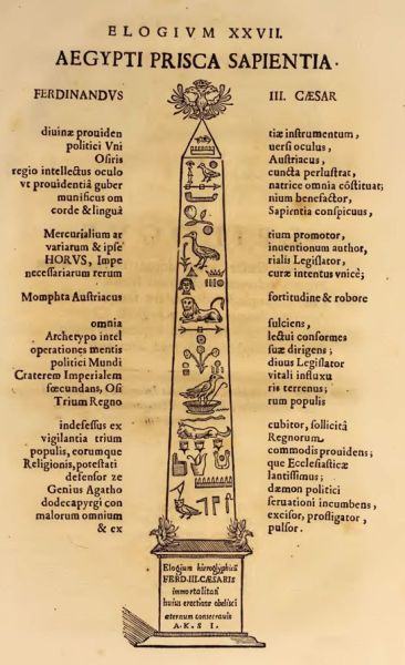 La strada aperta dallo studio sulla «Mensa Isiaca» di Lorenzo Pignoria (1571-1631) e dal Thesaurum Hieroglyphicorum (1610) fu seguita da Athanasius Kircher (1602-80), gesuita tedesco dotato di una cultura eccezionale che nella propria vita pubblicò una quarantina di scritti sugli ambiti più disparati dello scibile umano. A seguito della guerra dei trent’anni si trasferì prima ad Avignone e poi a Roma, dove arrivò nel 1635 per insegnare scienze matematiche.