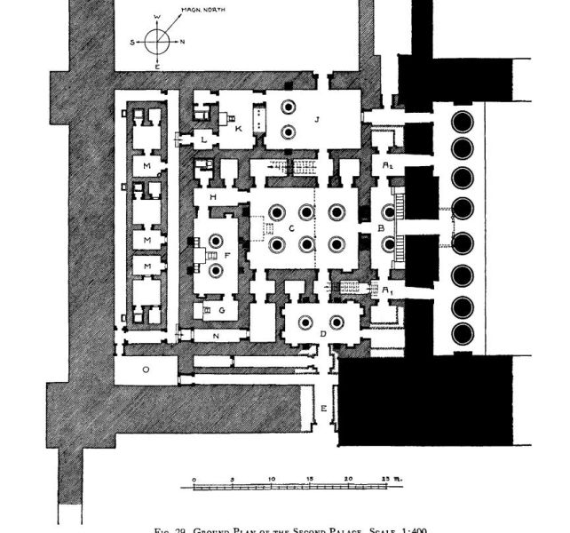 – la pianta del “secondo palazzo”. Le lettere indicano le varie stanze, così come spiegato nel testo.