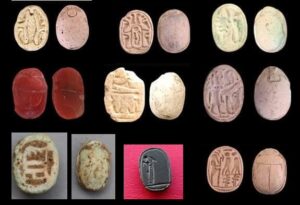 Tra i vari reperti, alcuni oggetti offrono anche indizi sul pensiero religioso e rituale dei soldati del forte. Sono stati rinvenuti amuleti e scarabei sacri, compresi alcuni con incisi i nomi di divinità come Amon, signore del cielo, e Ptah, dio della creazione. In particolare, un scarabeo di faience con l’iscrizione “Amon – Signore del Cielo” decorato con un fiore di loto e un altro scarabeo che porta la figura del dio Ptah, testimoniano la profonda connessione spirituale e il ruolo delle divinità nella vita dei soldati.
