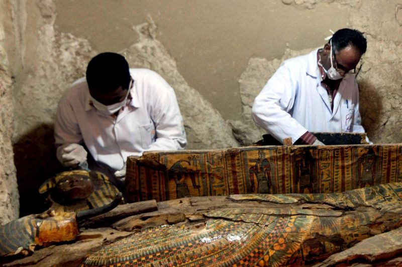 La tomba comprende un cortile aperto che conduce a due sale, una delle quali contiene quattro sarcofagi e l’altra sei. Il responsabile della missione archeologica ha detto che sono state rinvenute anche diverse tombe in legno e oltre mille statue funerarie.