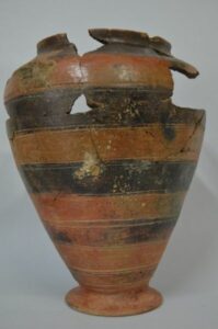 La tomba 6 (fig. 2), la prima quindi ad essere restaurata e qui presentata in anteprima, in occasione delle Giornate Europee dell’Archeologia 2022, era deposta in una cassetta di lastre in scaglia rosa dei Colli Euganei parzialmente conservata ed era composta da un vaso situliforme usato come ossuario (fig. 3), due coppe su stelo a fasce rosse e nere (fig. 4), una tazzina, un bicchiere, una fibula di tipo Certosa (fig. 5), che consentono di datare preliminarmante il contesto tra fine V e IV sec. a.C.