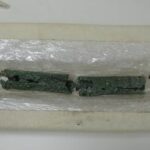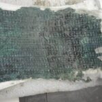 Il cinturone è ricostruibile per buona parte, e si compone della grande placca anteriore rettangolare, della parte terminale della cintura e di parti con gli anelli di riscontro. All’interno dell’ossuario, oltre alle ceneri dell’individuo defunto (presumibilmente di sesso femminile), erano deposti numerosi frammenti di lamine in bronzo, alcuni con evidenti tracce di combustione. L’ipotesi è che si tratti di un secondo cinturone indossato al momento della cremazione (fig. 8).