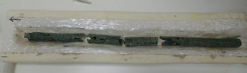 Gli elementi più interessanti però, che sono emersi già dalle prime fasi di scavo e che hanno reso delicato il recupero, sono i reperti in bronzo: (fig. 6) uno “scettro” frammentario, collocato sul fondo della cassetta e, aderente al corpo del vaso situliforme, quello che è apparso subito come un cinturone in bronzo, disposto con l’intento di alludere a una “vestizione” dell’ossuario, come testimoniato in numerosi contesti nel Veneto antico (fig. 7).