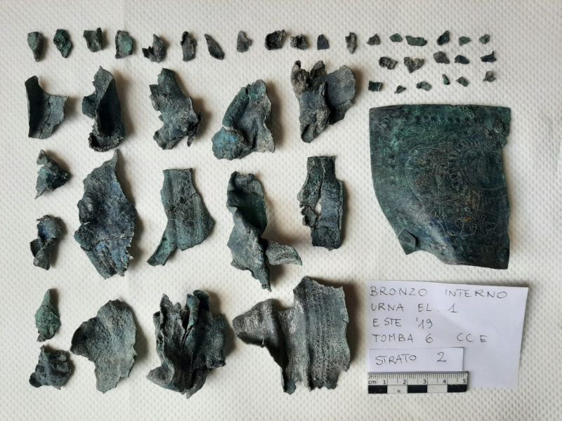 Tra i frammenti bronzei, spicca una lamina ritagliata e riutilizzata, che riporta una raffigurazione fantastica, con corpo di animale alato, di cui si trovano numerosi esempi in ambito veneto, soprattutto in contesti funerari.