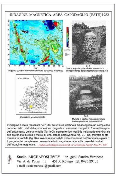 L’area, già nota da quando, alla fine del XIX secolo, nel fondo allora Capodaglio, erano venute alla luce numerose tombe di età preromana, era stata sottoposta a vincolo archeologico nel 1982, anno in cui, durante i lavori di costruzione di quello che diventerà in seguito l’attuale centro commerciale, furono intercettati un tratto stradale, una struttura interpretata come ustrinum (luogo dove si svolgevano le cremazioni) e alcune tombe. Vedi qui sotto il risultato di una precedente indagine magnetica del geofisico Sandro Veronese nel 1982.