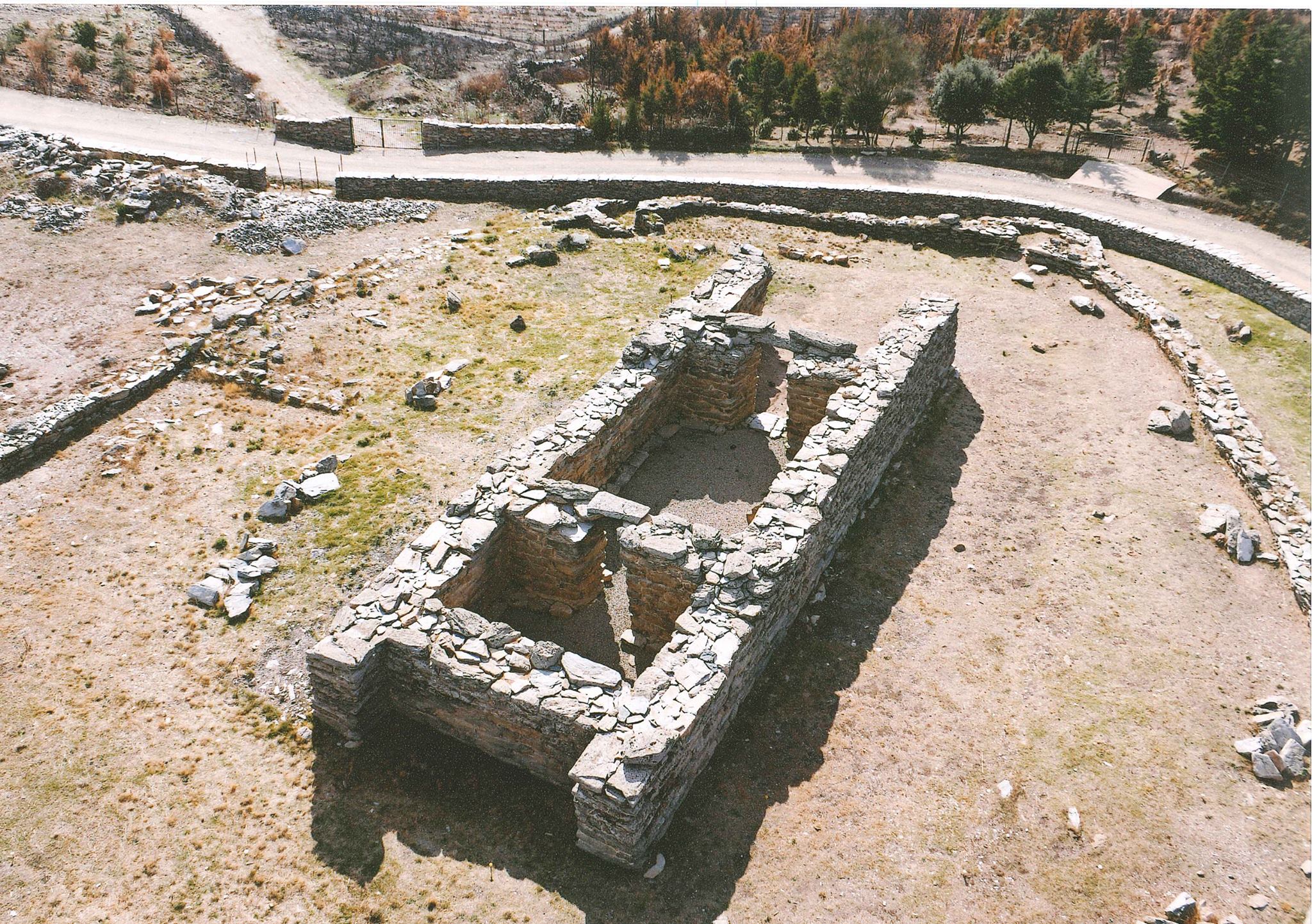 Il santuario, racchiuso da un recinto di forma ellittica, misura 22 metri e mezzo di lunghezza e poco meno di otto di larghezza. La struttura rettangolare, con forma allungata, è costituita da un vestibolo (detto “in antis”), realizzato sul prolungamento dei muri laterali, una cella divisa in due ambienti e un piccolo opistòdomo, situato dietro la cella, sul lato opposto all’ingresso. Il materiale di costruzione è lo scisto, lavorato in blocchi squadrati e disposti a filari orizzontali.
