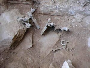 Nello stesso vano, in corrispondenza del bancone-sedile, sono stati rinvenuti frammenti di olle con decorazioni plastiche, ciotole, vasi per l’acqua necessaria durante le abluzioni rituali e piccoli recipienti in miniatura.