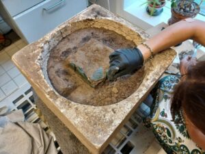 Ciò che rende questa scoperta ancora più affascinante è il suo contesto. Lo strumento è stato deliberatamente utilizzato per contenere, al suo centro, un’urna di vetro a sezione quadrata, che all’interno reca i resti di un defunto cremato. All’interno della tomba è stato rinvenuto un anello d’oro decorato con un intarsio viola (si presume sia ametista), recante l’iscrizione greca “SANKTOS”. Questo suggerisce che l’oggetto potrebbe avere avuto un significato particolare o un legame speciale con il defunto.