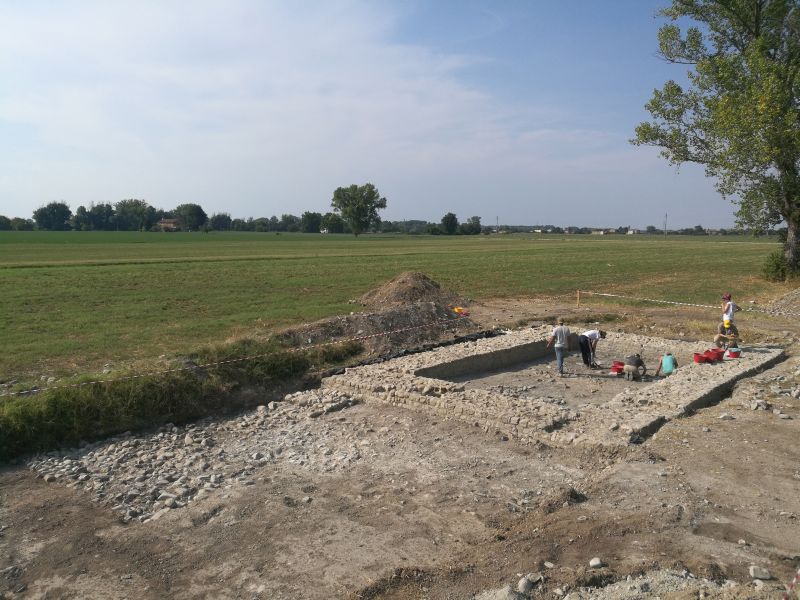 Lo scavo 2018 ha rivelato una strada romana finora sconosciuta che corre in direzione N-S. Risulta larga oltre 4 m e reca il segno del passaggio dei carri; è inoltre pavimentata con ciottoli fluviali disposti con cura, cosa che, nell’antica Aemilia ma anche in tutta la Cisalpina, è tipica solo delle strade urbane oppure dei tratti immediatamente fuori dalle città.