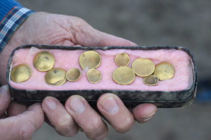 All’improvviso, nella zolla, emergente, ha notato quello che gli è apparso come il tappo dorato di un liquore. Lucido, perfetto. Diremmo noi italiani: come un’orecchietta d’oro. Alla fine sono stati trovati 41 pezzi di monete lisce a coppella.