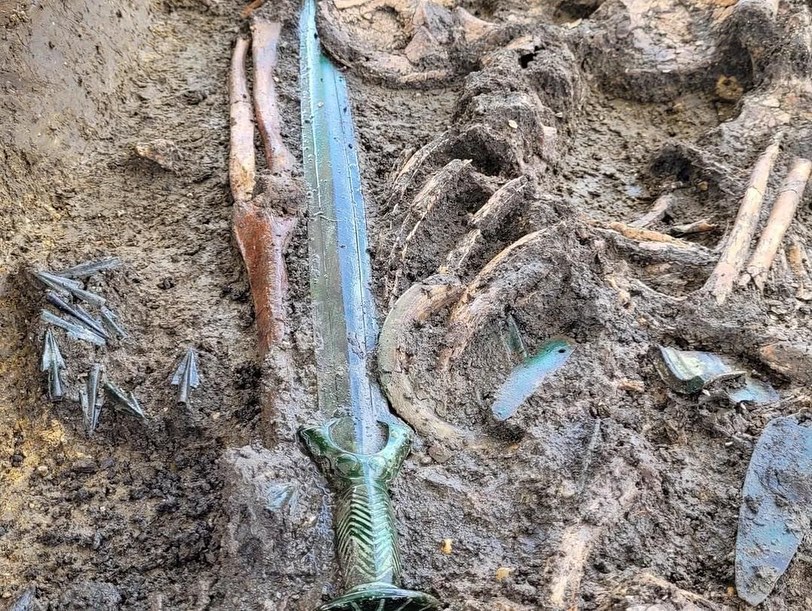 La spada è stata trovata in una tomba in cui tre persone con ricchi doni di bronzo furono sepolte in rapida successione.