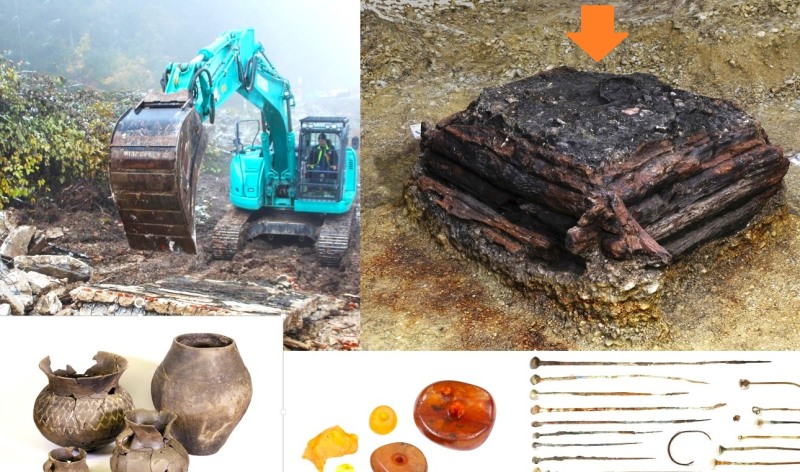 Oltre agli spilloni di bronzo – materiale prezioso, all’epoca – ed ai recipienti in ceramica, la squadra di scavo ha rinvenuto anche un braccialetto, due spirali metalliche, un dente di animale incastonato, quattro grani d’ambra, un recipiente di corteccia, una paletta di legno, possibili festoni di vegetali intrecciati e numerosi resti botanici, sul fondo.