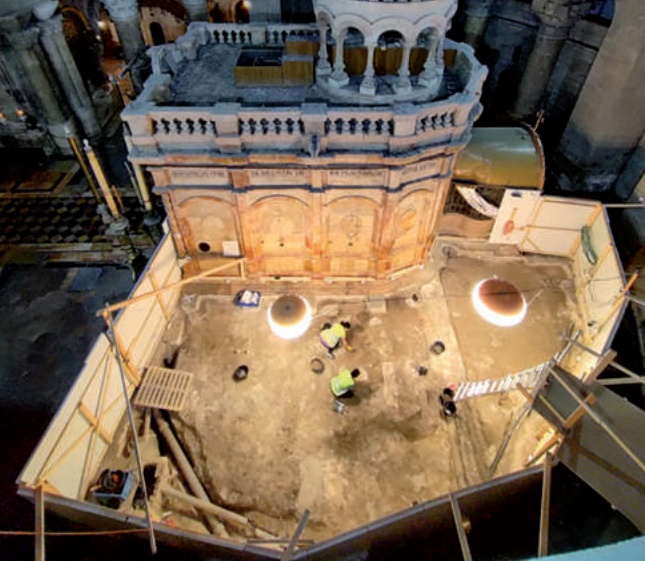 Il lavoro di scavo, attivo sia di giorno che di notte, ha permesso di portare alla luce diversi materiali, antichi e recenti, che approfondiscono l’utilizzo e la conoscenza del contesto archeologico. Lo stesso valore ha il ritrovamento delle fasi del cantiere costantiniano a vari metri di profondità, nell’area degli Archi della Vergine, dove i lavori di costruzione della basilica nel IV secolo d.C. hanno sfruttato la precedente cava per impostare le fondazioni. Ed è una scoperta straordinaria – e una grande emozione per gli archeologi che l’hanno svelata al di sotto dell’attuale Edicola – il ritrovamento della prima monumentalizzazione della tomba di Cristo, composta da una pavimentazione marmorea di forma circolare, confermandone le più antiche rappresentazioni.