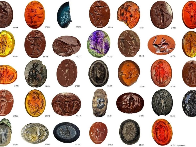 Scolpite su pietre semipreziose come la corniola, l’ametista, il diaspro e la corniola – in dimensioni che vanno da 5 mm a 16 mm – le pietre semipreziose furono incise da artigiani, che hanno realizzato minute immagini di divinità romane tra le quali, in modo ricorrente, si riconoscono Venere, Cerere, Fortuna e Apollo. Ciò che stupisce gli archeologi è che il repertorio iconografico sia – quantomeno – poco maschile. Sono infatti un numero esiguo le gemme incise che recano immagini collegate al mondo militare. La frequentazione femminile delle terme è dimostrata anche dal ritrovamento, nello scarico, di 105 perle di vetro per collane o braccialetti e 40 forcine per le acconciature femminili. Nel condotto sono state portate alla luce anche piccole armi e monete romane, oltre che lacerti di ceramica.