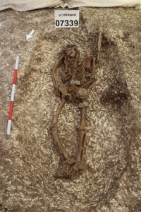 Un’altra sepoltura presentava i resti di un giovane con un ferro appuntito infisso nella spina dorsale dell’individuo. Lo scheletro, appartenente a un individuo maschile di età compresa tra i 17 e i 24 anni, è stato esaminato da osteologi specializzati che ritengono che l’arma abbia colpito la parte anteriore del corpo prima di conficcarsi nella colonna vertebrale.